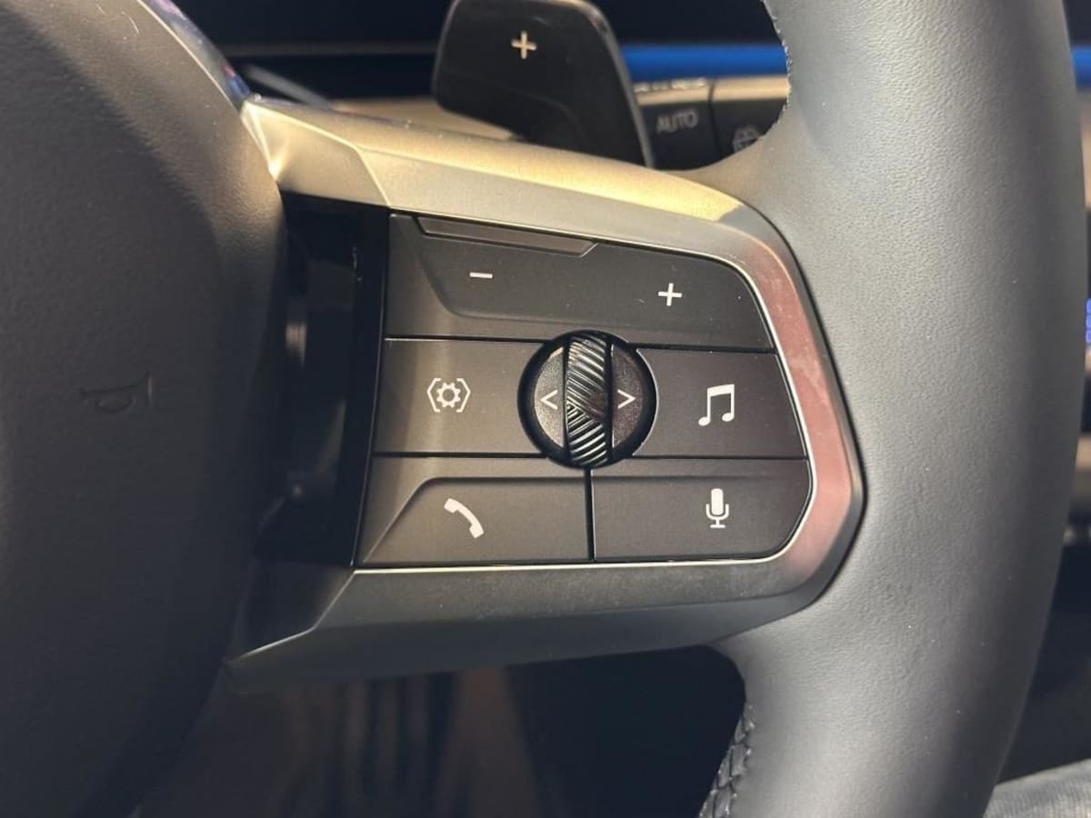 volant m gainé cuir (avec surpiqûres noires) trois branches. jante en cuir noir 'walknappa', inserts chrome perlé et repose-pouce dans le volant. logo m sur la base du volant