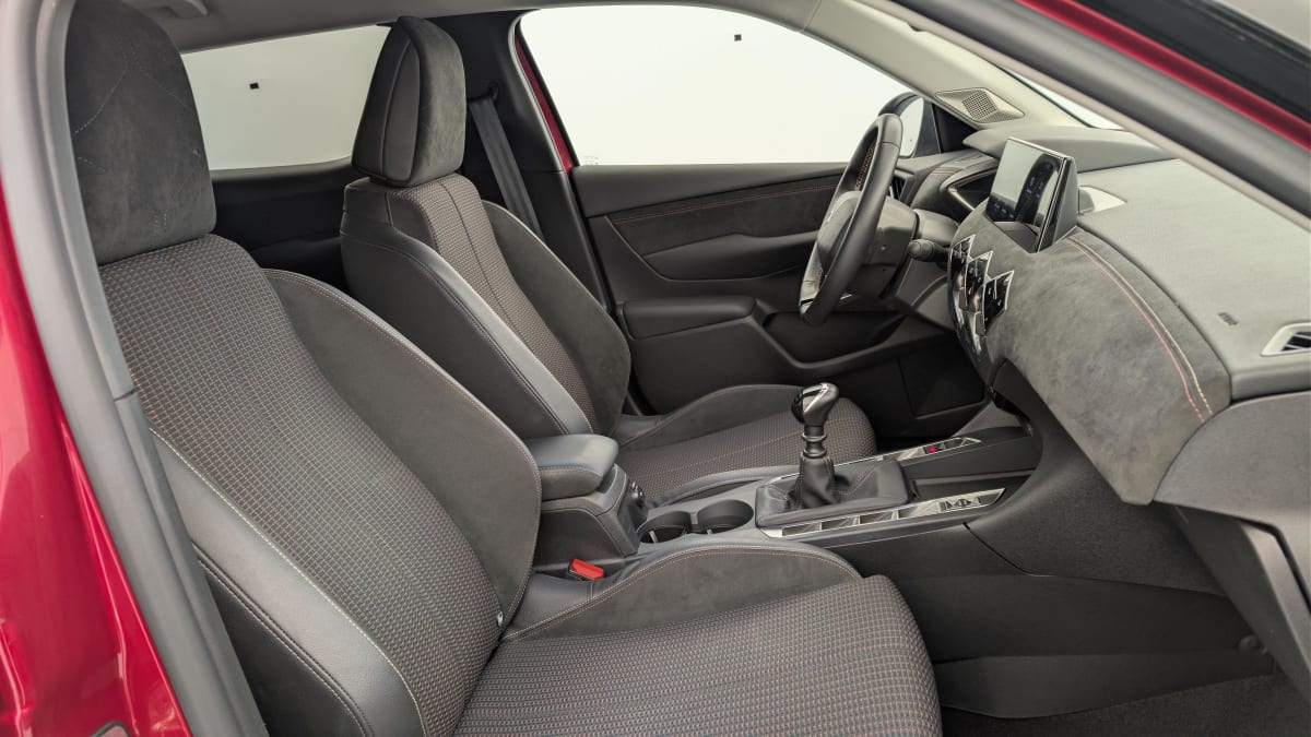 intérieur tissu tressé basalte avec alcantara : planche de bord alcantara noir ciel de pavillon gris galet volant cuir fleur perforé et coutures or et carmin décor alcantara noir siège tissu tressé basalte avec alcantara