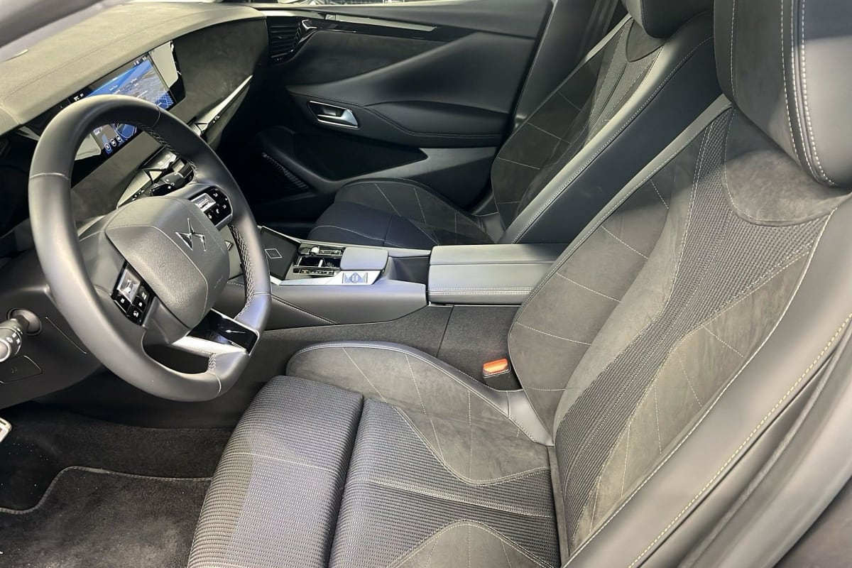 intérieur alcantara noir : planche de bord en alcantara ciel de pavillon clair sellerie en tissu tressé basalte avec alcantara et toile ds décors de panneaux de porte chrome guilloché volant cuir fleur mistral console en toile ds noir basalte panneaux de porte en alcantara et toile ds noir basalte