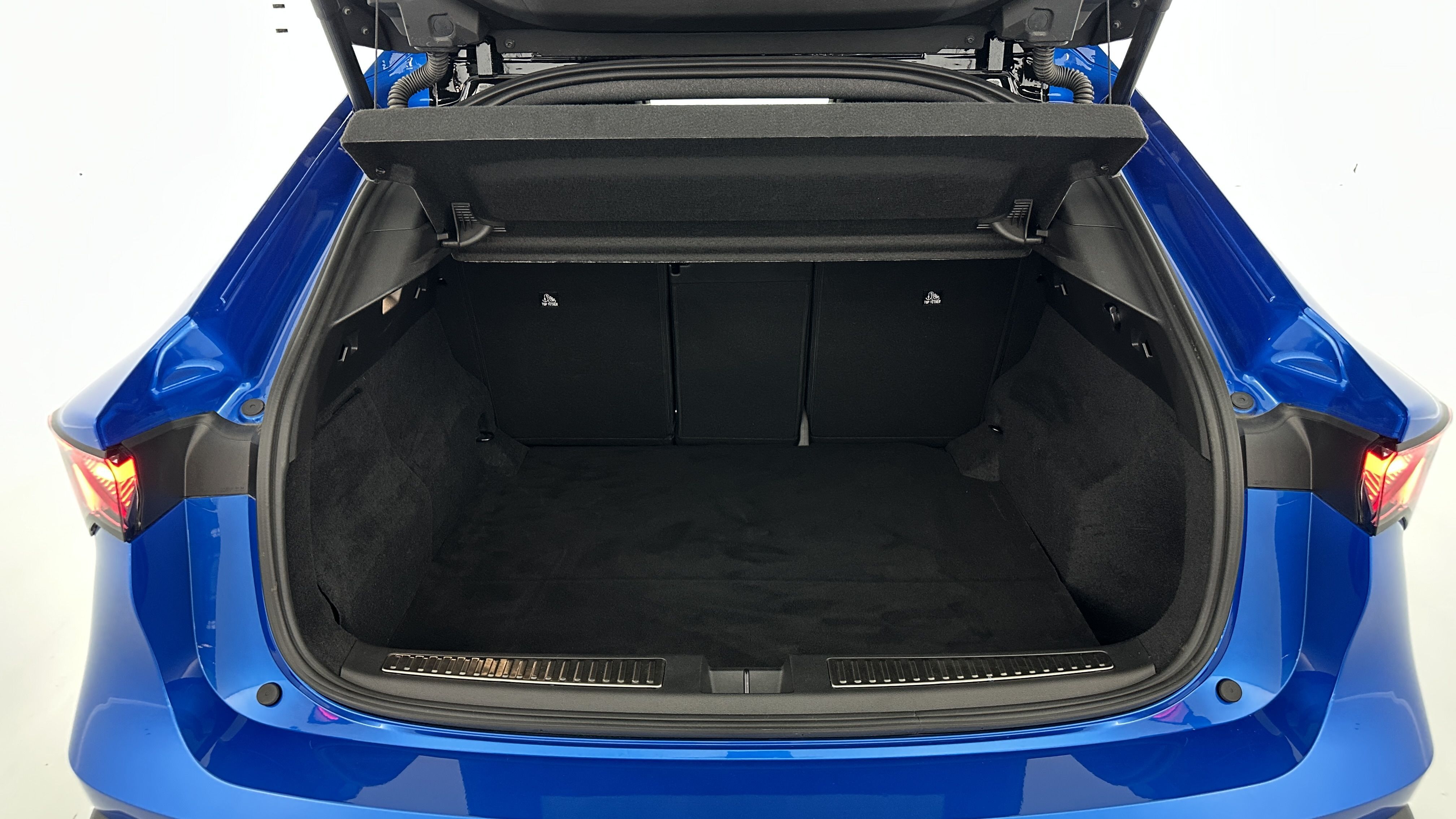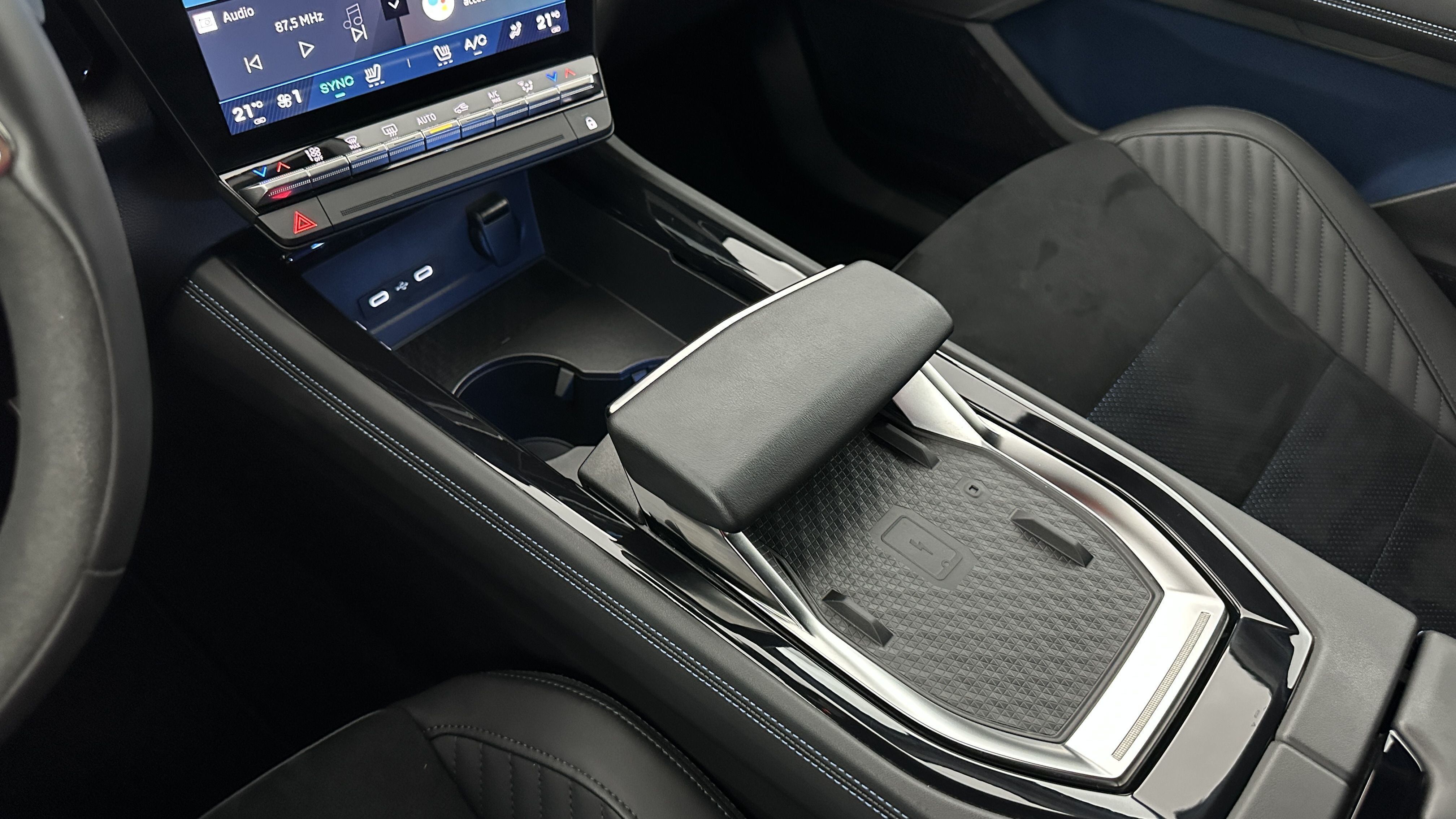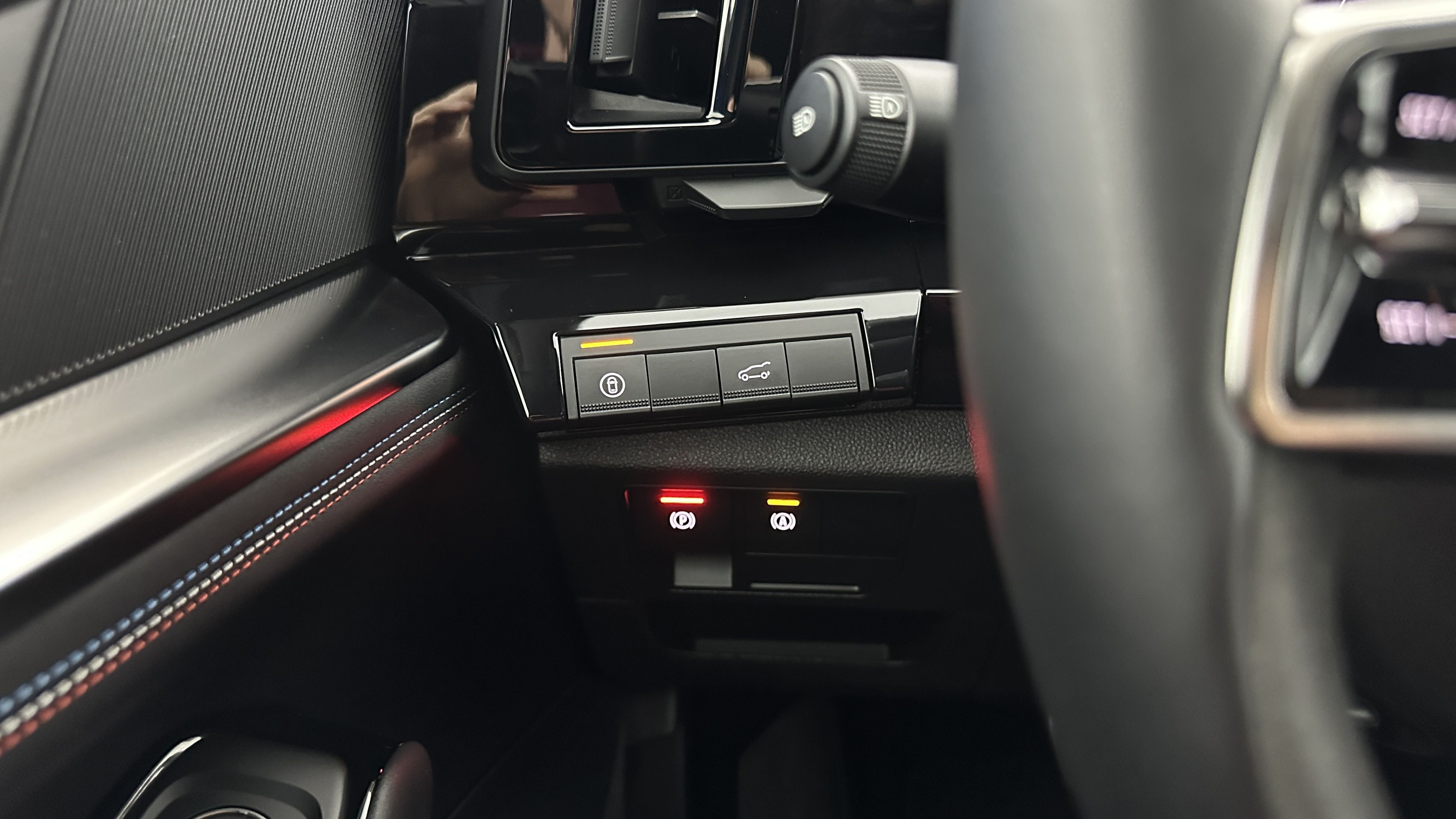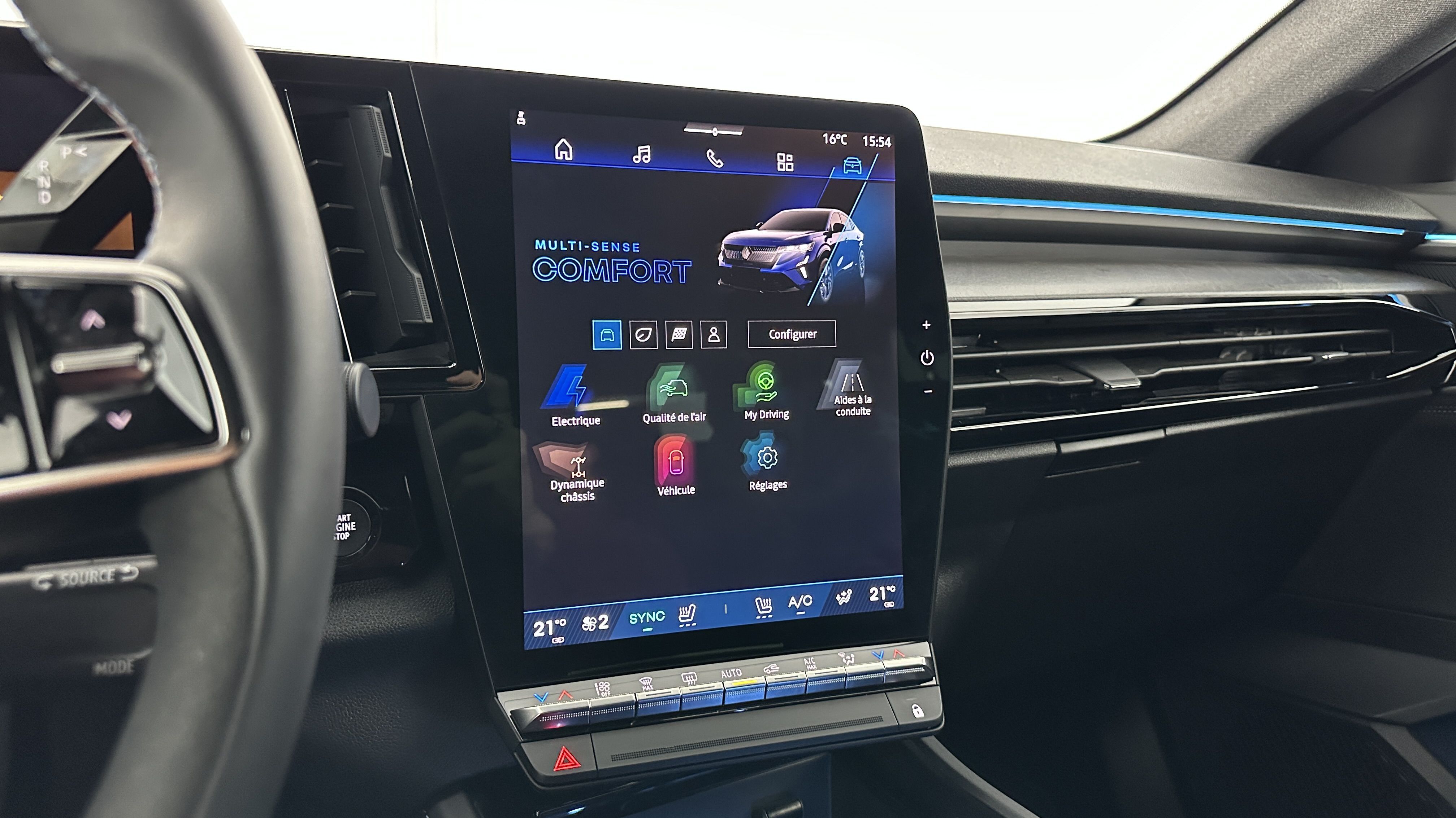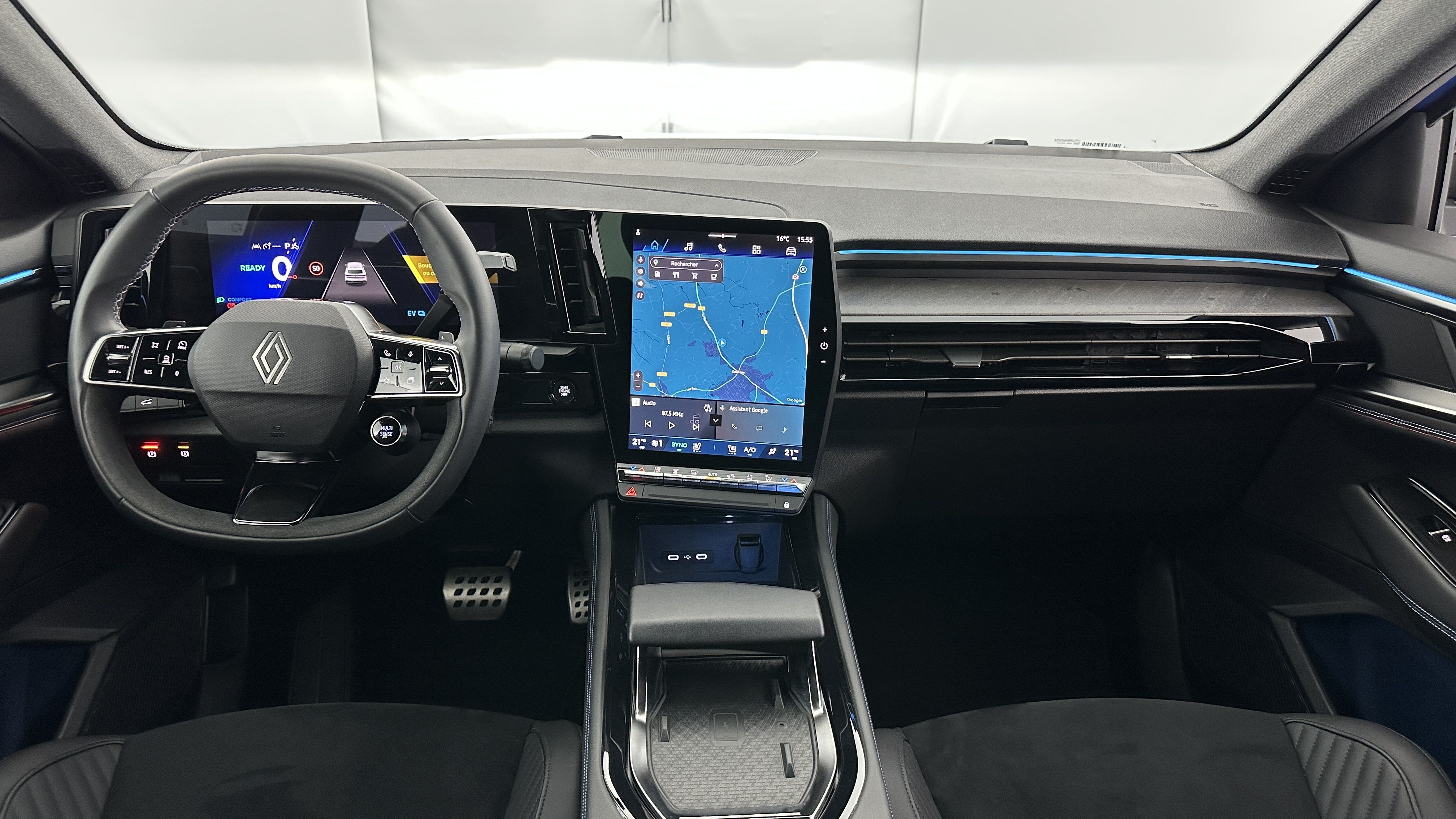 Sellerie mixte Alcantara avec surpiqûres bleues et logo Alpine lumineux